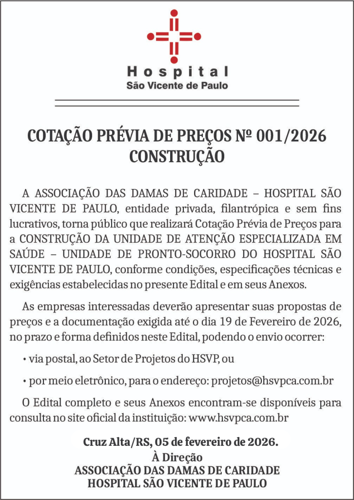 A ASSOCIAÇÃO DAS DAMAS DE CARIDADE – HOSPITAL SÃO VICENTE DE PAULO, entidade privada, filantrópica e sem fins lucrativos, torna público que realizará Cotação Prévia de Preços para a CONSTRUÇÃO DA UNIDADE DE ATENÇÃO ESPECIALIZADA EM SAÚDE – UNIDADE DE PRONTO-SOCORRO DO HOSPITAL SÃO VICENTE DE PAULO, conforme condições, especificações técnicas e exigências estabelecidas no presente Edital e em seus Anexos.