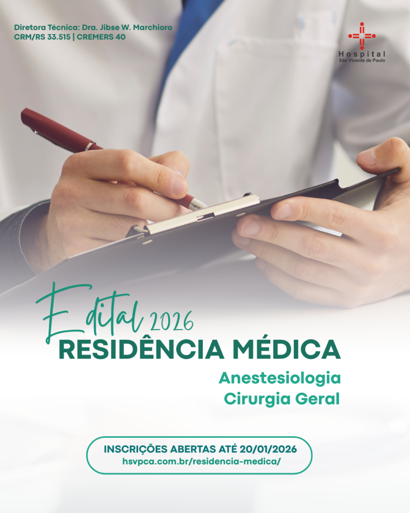O Hospital São Vicente de Paulo de Cruz Alta-RS (HSVPCA) comunica que estão abertas as inscrições para seleção dos candidatos ao preenchimento de vagas para médicos residentes nos Programas de Residência Médica 2026 em: