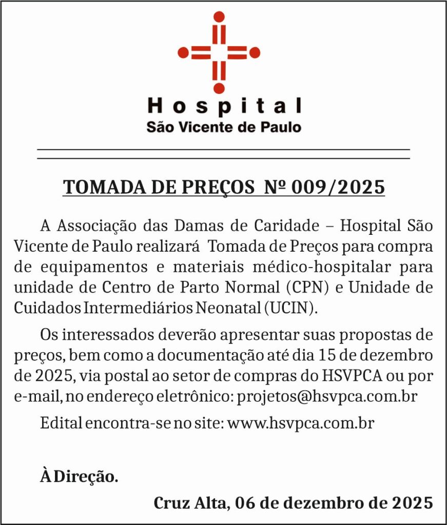 A Associação das Damas de Caridade – Hospital São Vicente de Paulo realizará Tomada de Preços para compra de equipamentos e materiais médico-hospitalar para unidade de Centro de Parto Normal (CPN) e Unidade de Cuidados Intermediários Neonatal (UCIN).